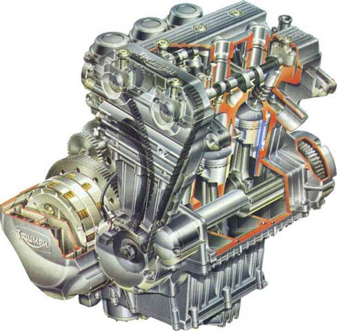 Ainsi, en utilisant deux valeurs d'alésage/course de bases, Triumph arrive à obtenir un 750/3 cylindres et un 1000/4 cylindres (76 x 55mm) ainsi qu'un 900/3 cylindres et un 1200 /4 cylindres (76 x 65mm).